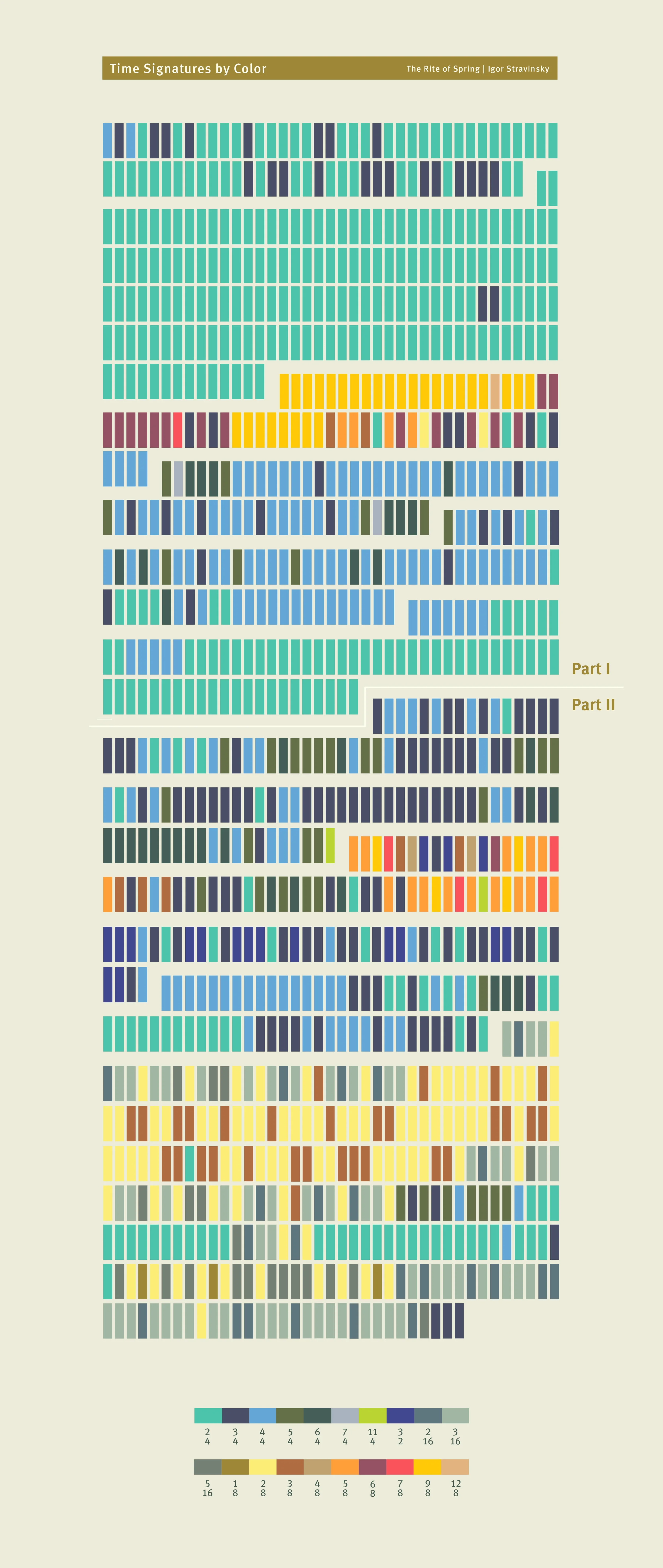 This project from my junior year of undergrad at SUNY Fredonia explores Stravinsky's revolutionary piece of music in terms of its physical structure, as well as its more abstract interpretations. The infographics represent a breakdown of the score itself; through color and symbol, I represent each of the 20 time signatures that Stravinsky employs, measure by measure. The score cards are an expression of the less formal aspects of the piece. A deck of 14 cards, each card features an illustration of my own personal interpretation and mental images I experienced while listening to the piece.
